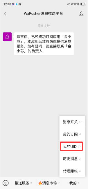 提示成功订阅应用「金小芯」, 下载WxPusher App安装到手机