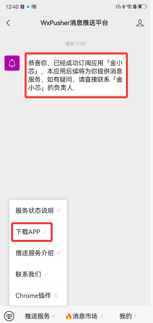 提示成功订阅应用「金小芯」, 下载WxPusher App安装到手机